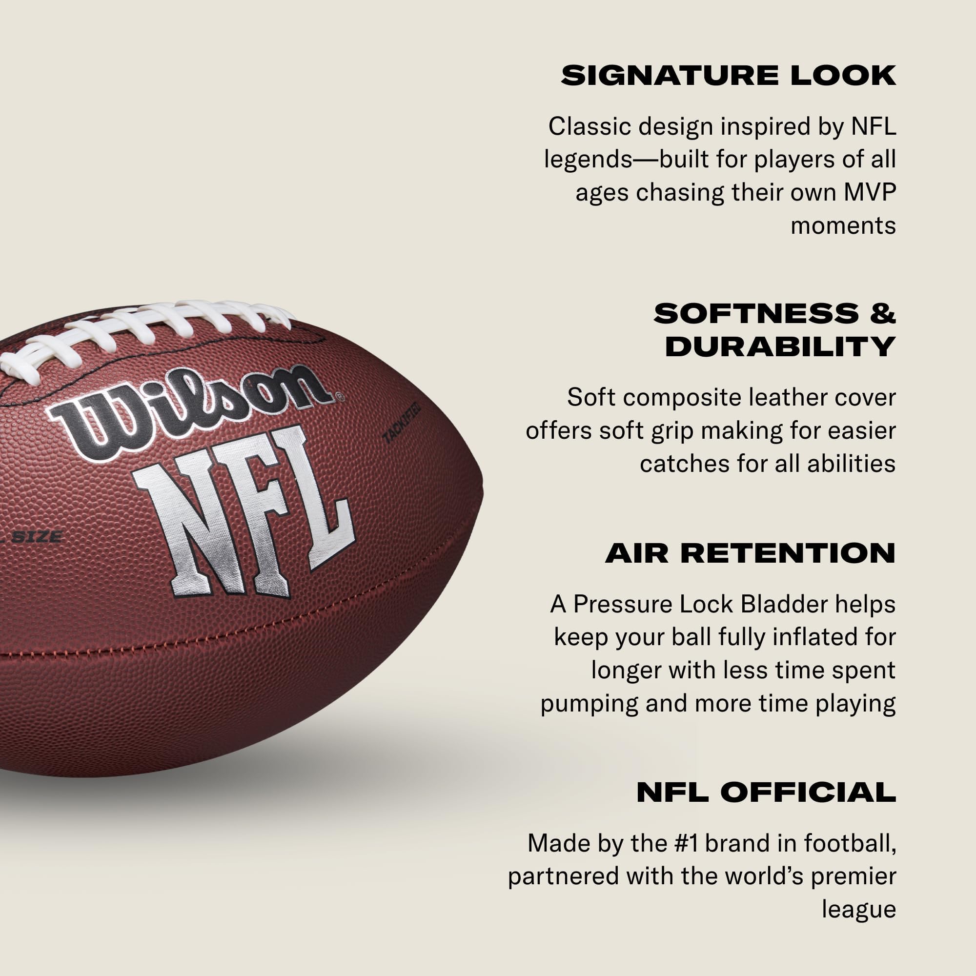 - אותנטיות של ה-NFL: וילסון הוא כדור הכדורגל הרשמי של ה-NFL וזוכה לאמון של הספורטאים הטובים בעולם כבר למעלה מ-100 שנה.