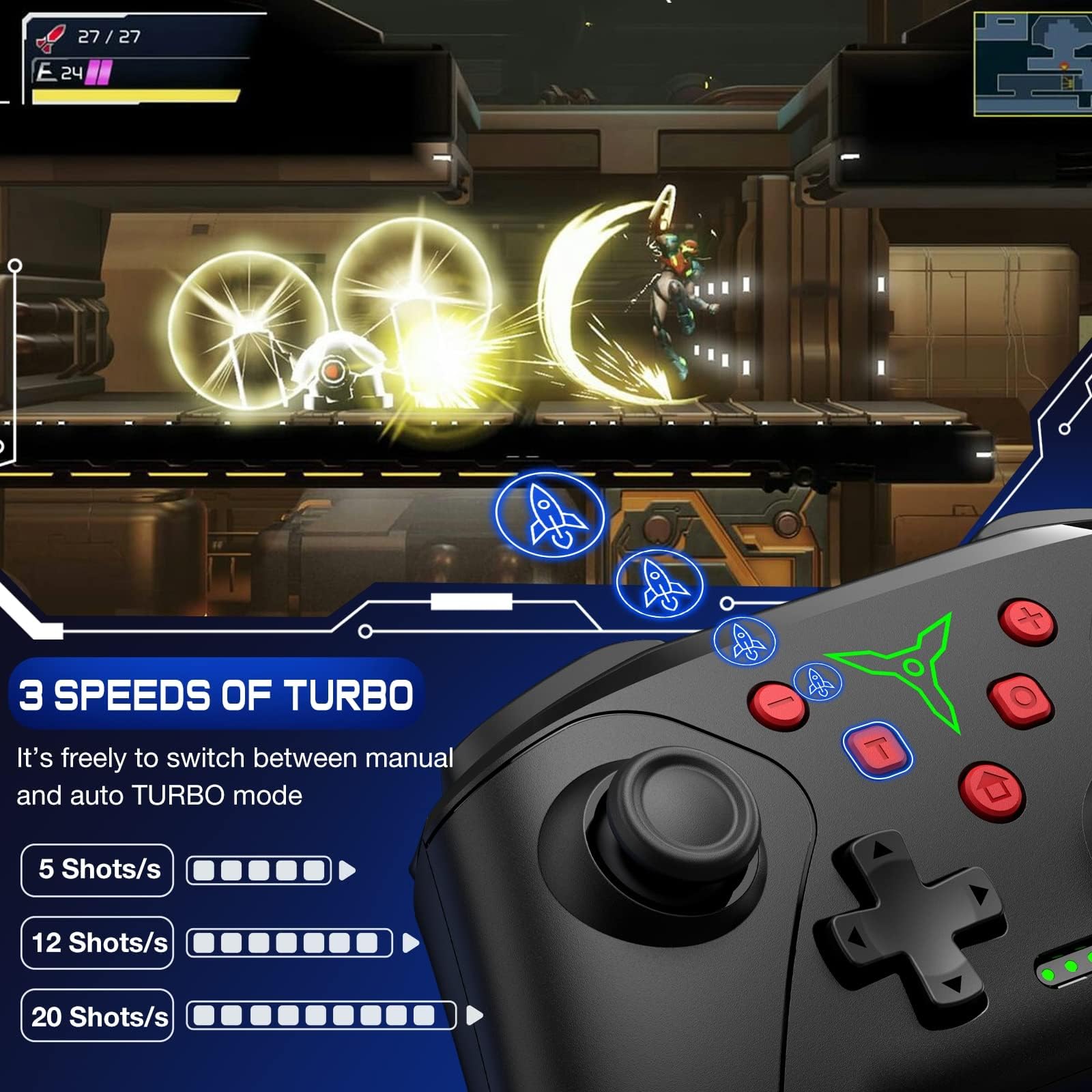 - 【עיצוב ארגונומי ופונקציית טורבו】 שלט המתג המקצועי בעל העיצוב הארגונומי והמונע החלקה מאפשר לך לשלוט במשחק ביציבות מבלי לדאוג מזיעה בידיים. ניתן להגדיר את בקר המתג האלחוטי למצב טורבו אוטומטי או טורבו ידני. ישנן 3 מהירויות מתכווננות: 5 יריות/שנייה, 12 יריות/שנייה או 20 יריות/שנייה. ניתן גם להתאים אישית את כפתור ה-TURBO, A/B/X/Y/L/ZL/R/ZR כל הכפתורים ניתנים להגדרה ל-TURBO, מה שמקל על ניצחון במשחק ארקייד או פעולה.
