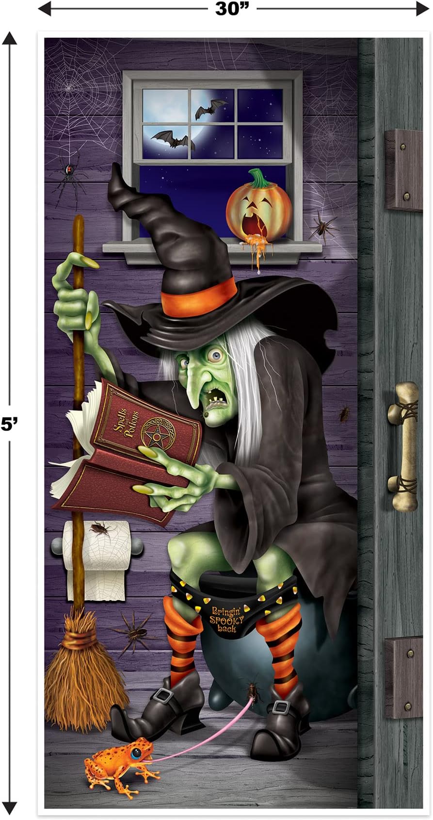 כיסוי לדלת לשירותי מכשפות Beistle 00026. כל כיסוי לדלת מודפס בצד אחד על פלסטיק 2.25 מיל ומידותיו 30 אינץ' על 5 רגל. לשימוש פנימי וחיצוני. נהדר לכל מסיבת ליל כל הקדושים ביתית.