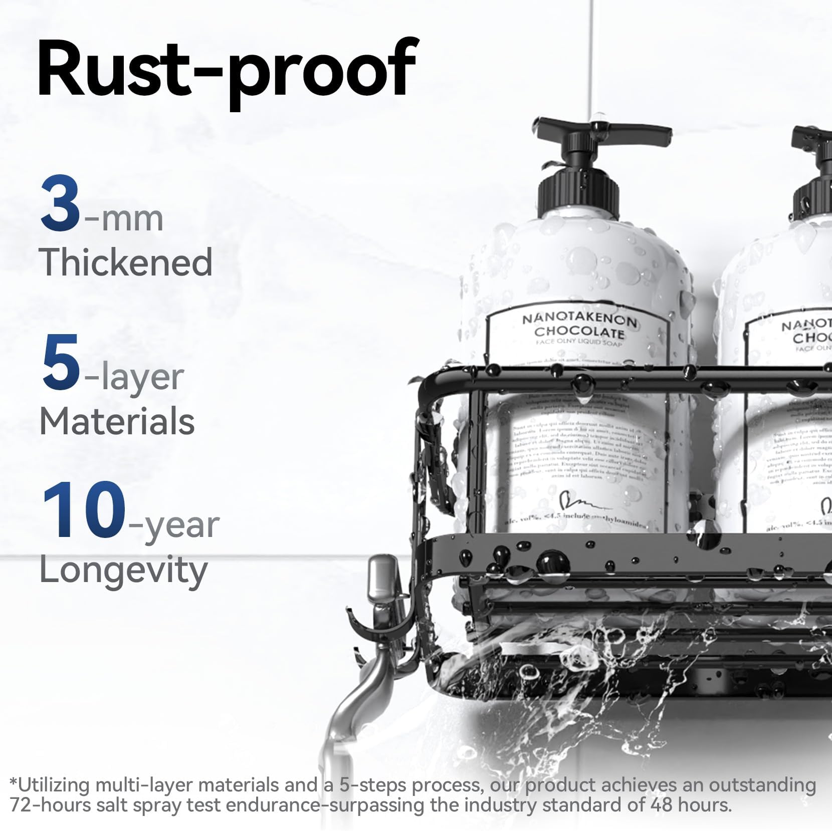 - פלדת אל-חלד 304: חוטים מחוזקים בעובי 3 מ"מ וציפוי שריון עמיד בפני חלודה בעל 5 שכבות, שרדו 72 שעות של ריסוס מלח ASTM B117 ו-10,000 בדיקות כיפוף. אורך חיים ארוך פי 2 ממדף מקלחת בסיסי למקלחת פנימית