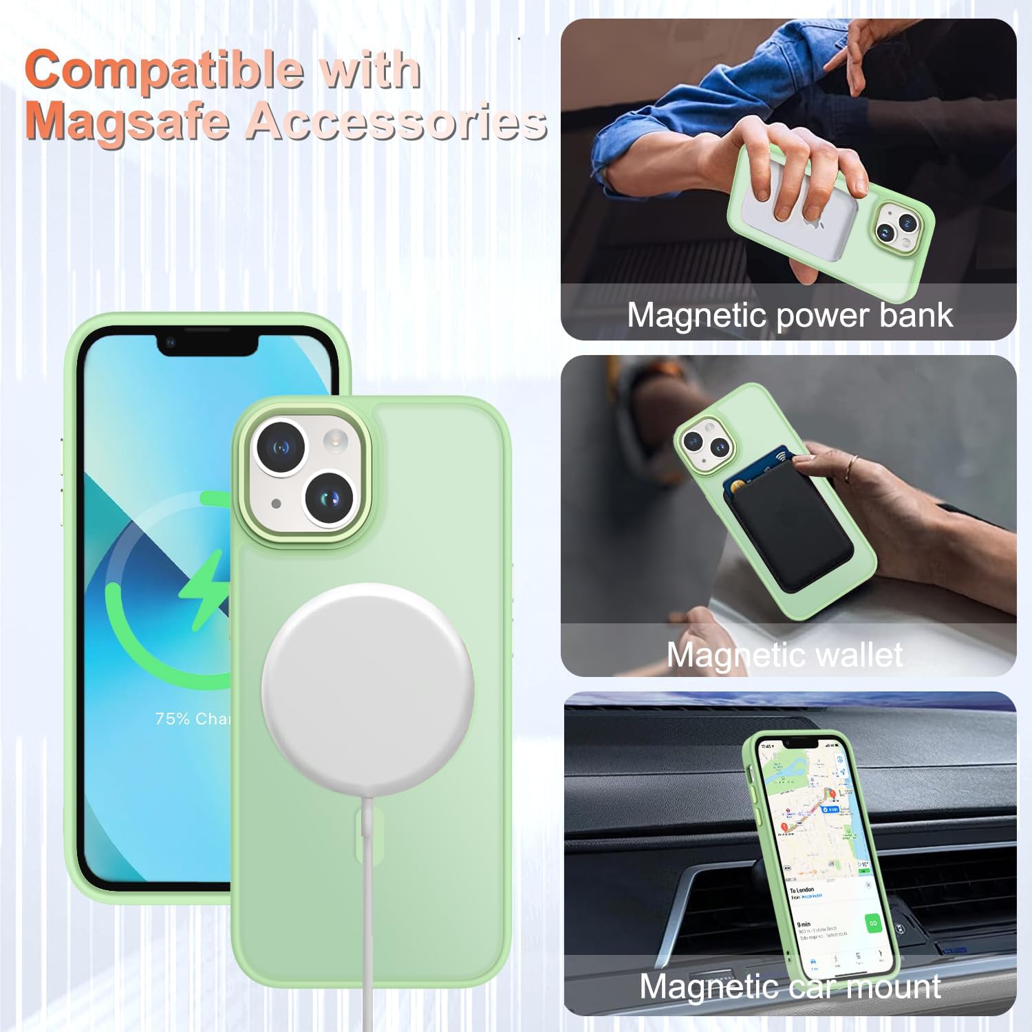 - תואם ל-Magsafe ול-Magnetic: טבעת מגנטית מובנית המספקת משיכה מגנטית מעולה. תואם לרוב האביזרים של Magsafe ומגנטים, כגון מטענים אלחוטיים של Mag-Safe ו-Qi, תושבות מגנטיות לרכב, מחזיקים מגנטיים, ארנקים מגנטיים ובנקי סוללות מגנטיים. מעניק לכם חוויית טעינה בטוחה, מהירה ונוחה יותר.