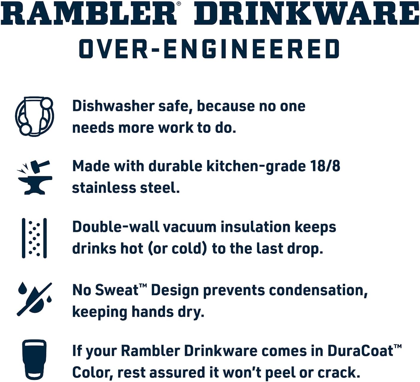 - ה-Rambler 20 oz. עשוי מפלדת אל-חלד עמידה עם בידוד ואקום כפול להגנה על המשקה החם או הקר שלכם בכל מחיר.