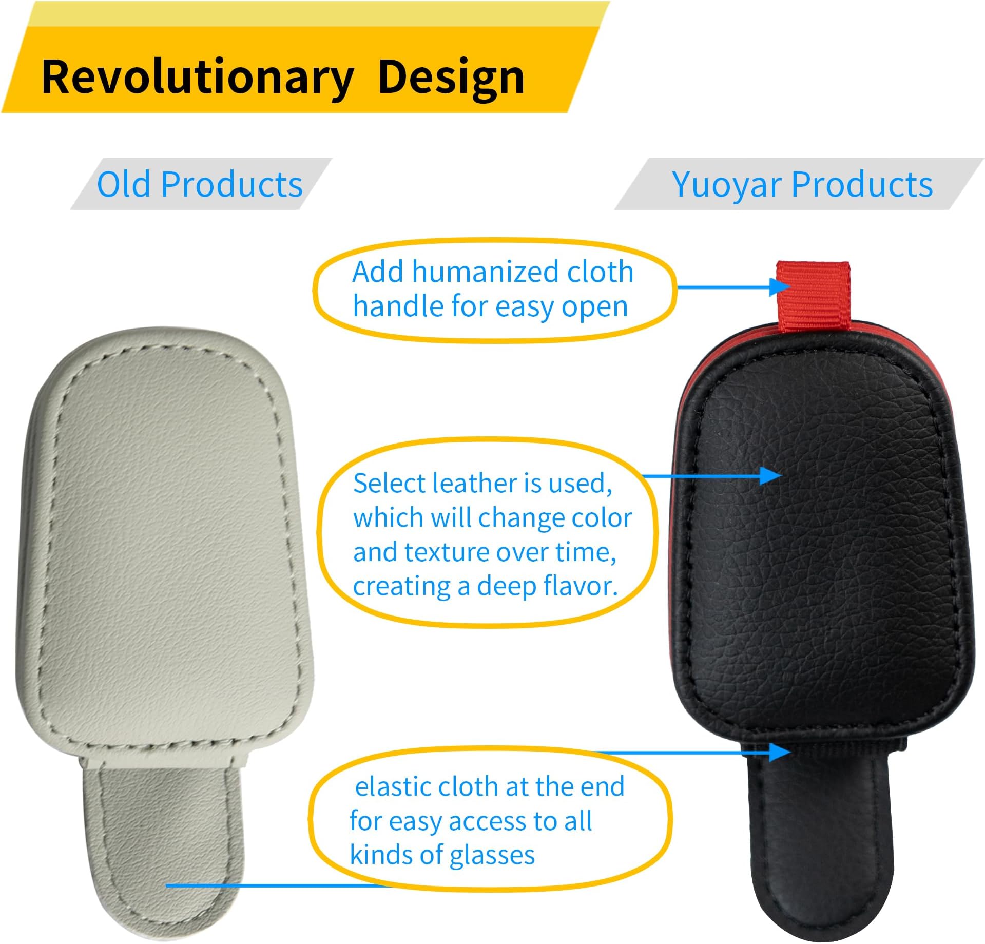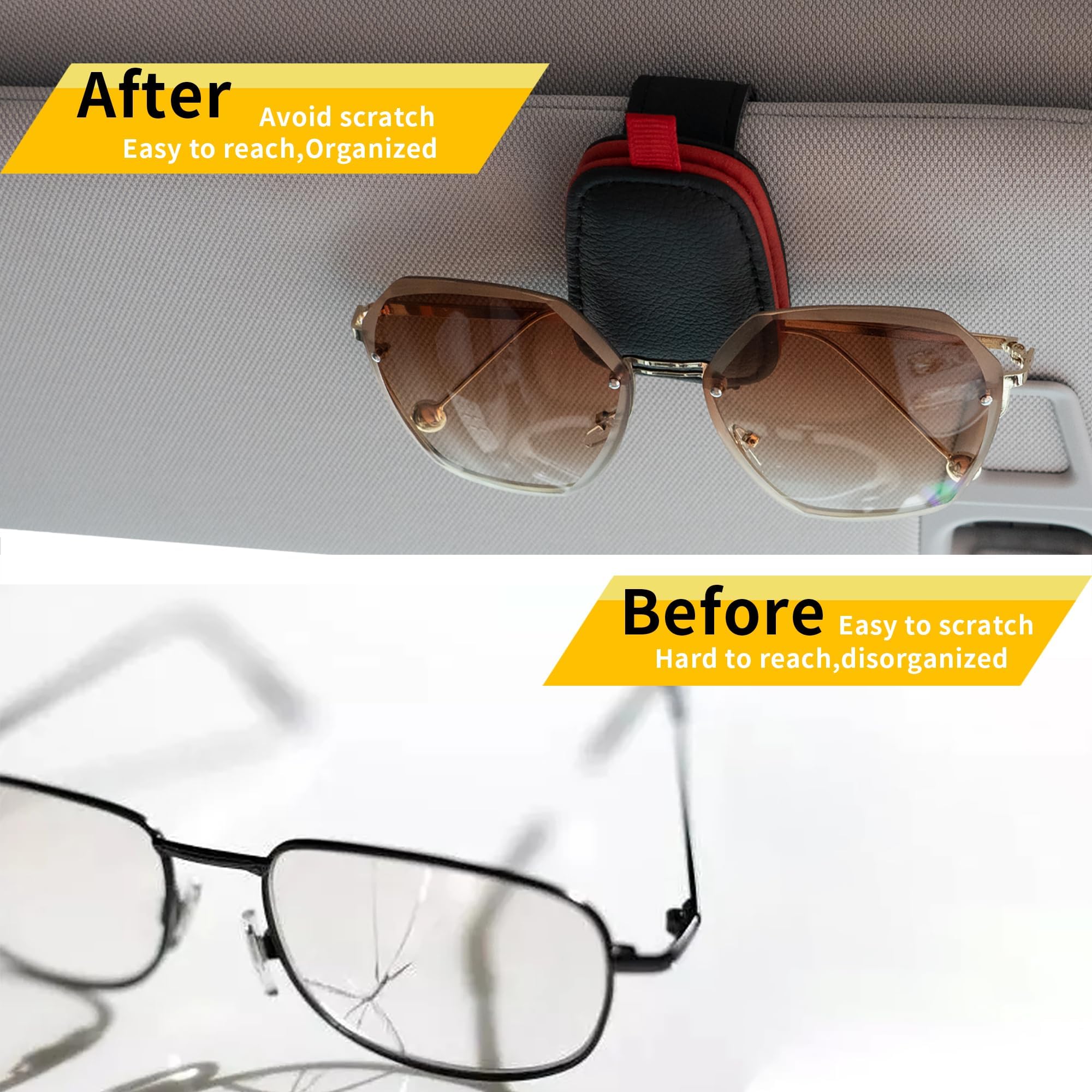 - כיסוי עור מלא: מגן השמש והמשקפיים שלך יישארו שלמים מכיוון שמחזיק משקפי השמש למשקפי השמש לרכב עשוי מעור איכותי עם תחושה רכה שעוטפת לחלוטין את הקליפס.
