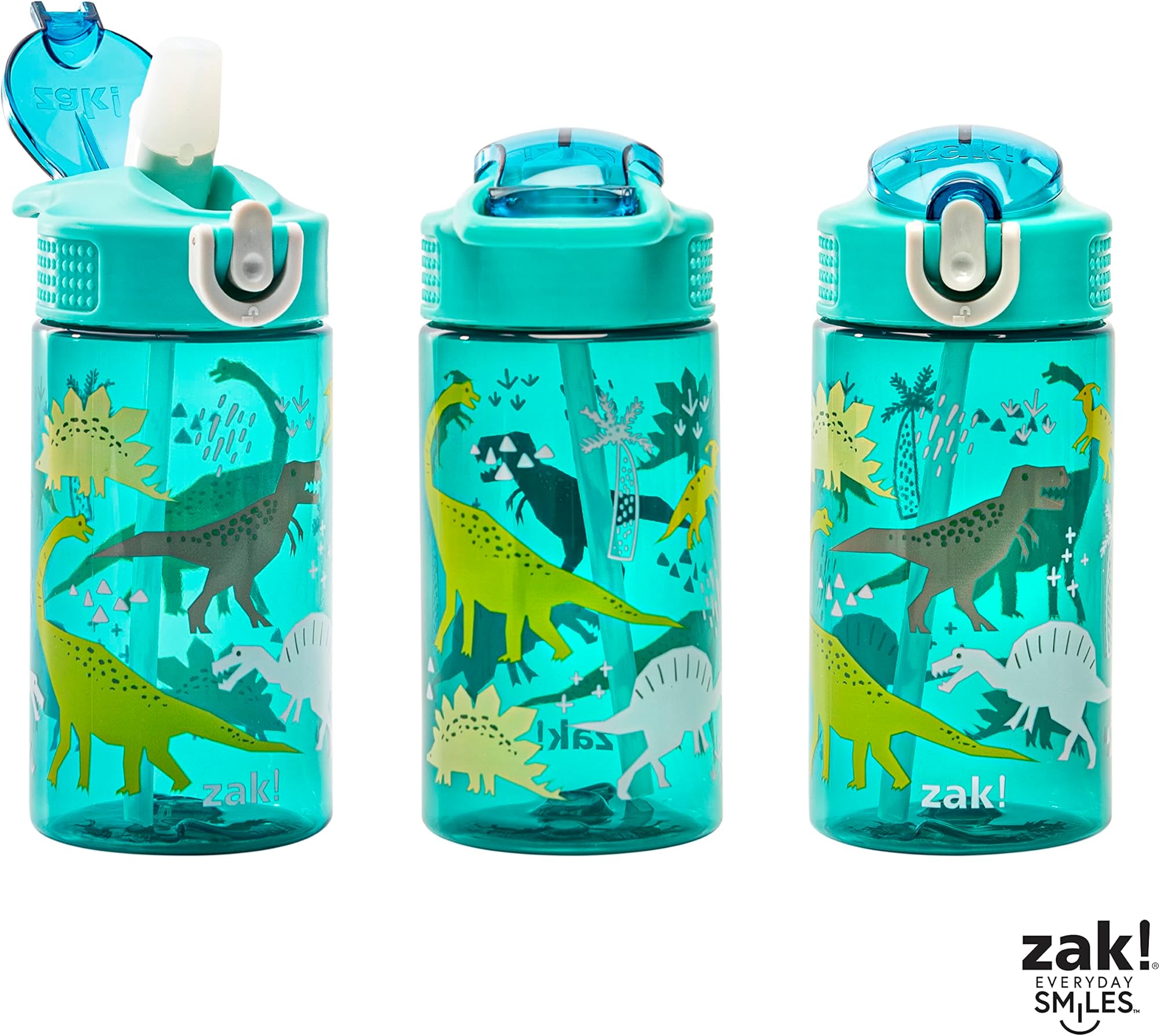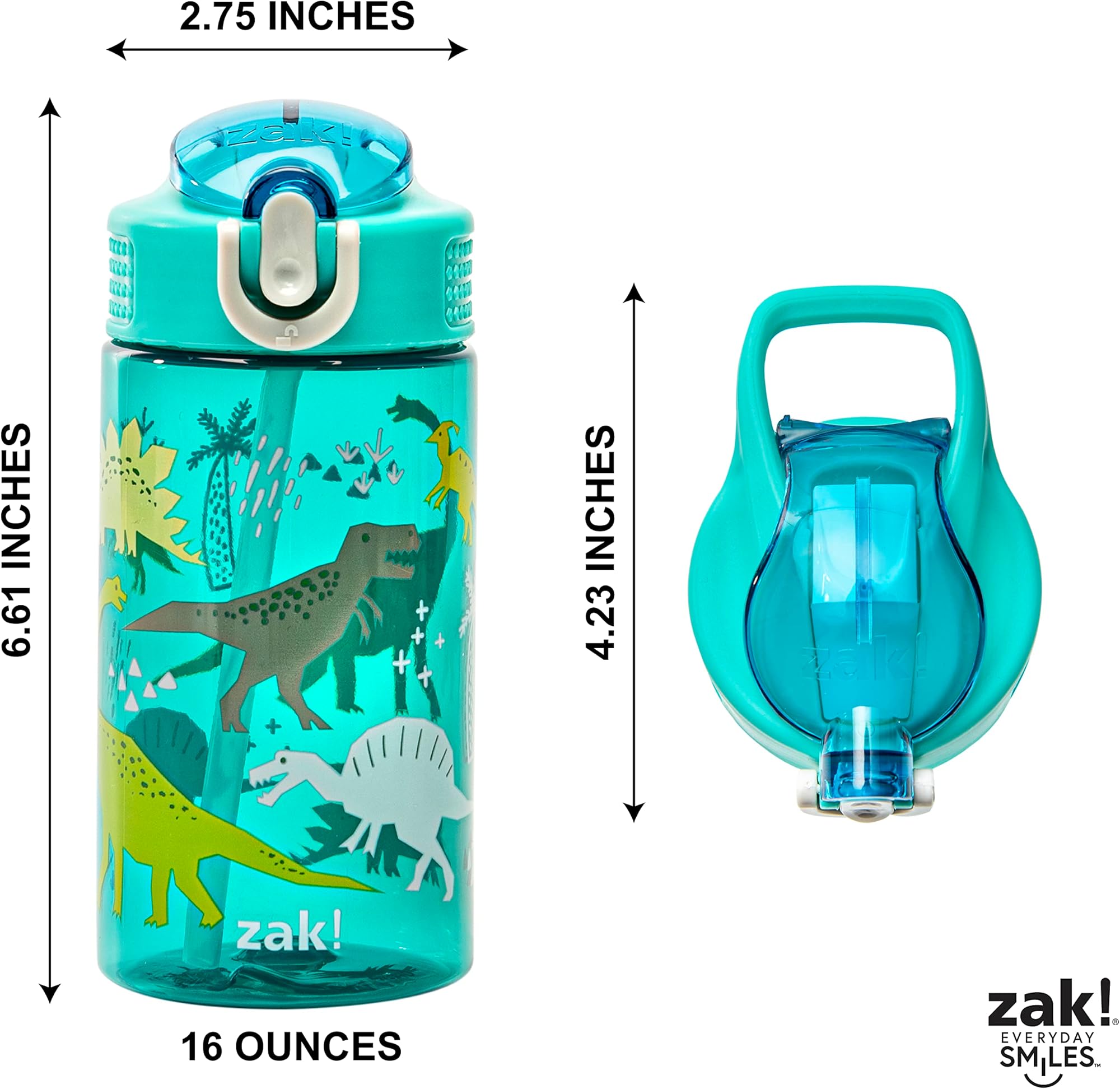 Let kids enjoy hydration with a fun water bottle by Zak Designs! Reusable and Durable Material: Reusable water bottles will last wash after wash—good news for you and the environment! The 16 oz water bottle is made of PP plastic, durable enough for kids to use every day and bring on any adventure. Leak-Proof Lid: The lid screws on securely and won't leak when the spout is closed, though water flows for easy drinking when the spout is open. The easy-open button has a flip-up lock to keep it from activating accidentally. On the Go: The water bottle has a built-in carrying loop on the lid for easy transportation, and with the spout cover to keep the spout clean and closed, it can be tossed into a bag for worry-free travel. Specifications: 16 oz capacity. Made of durable plastic. BPA-Free - Zak is committed to safety. Dishwasher safe, do not microwave. Length: 4.23-inch, Width: 2.75-inch, Height: 6.61-inch. Design: Dinosaur.
